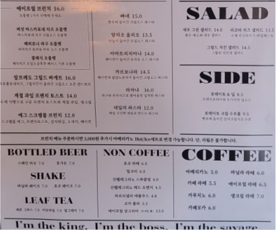 저는 달걀 입힌 토스트와 오믈렛을 먹고 싶어서 에이프릴 브런치를 주문했습니다.