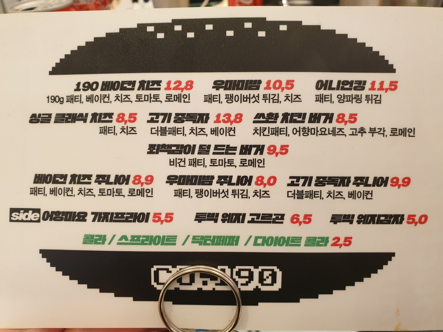 Co.190 (수제햄버거 맛집) 주소 : 서울 성동구 서울숲길 37 1층 (서울 성동구 성수동1가 685-405) 전화번호 : 02-499-0190 영업시간 : 매일 11:30 ~ 21:00 (브레이크타임 15:00 ~ 17:00) 주차 : 주변이 전부 골목길이라 어떻게 주차는 가능 할 것 같은데 벌금 조심하세요. 전용 주차장은 없는 것 같습니다. |